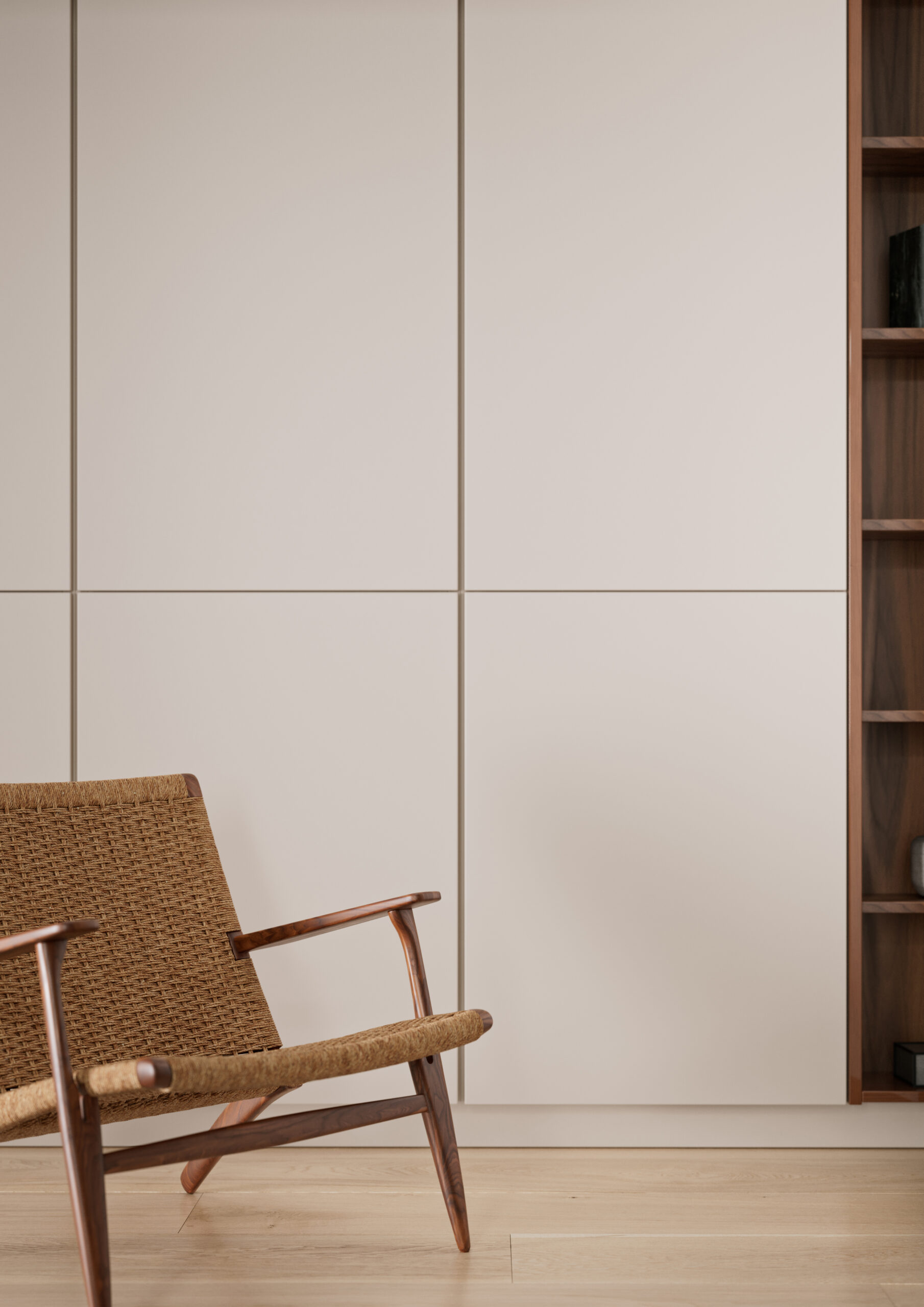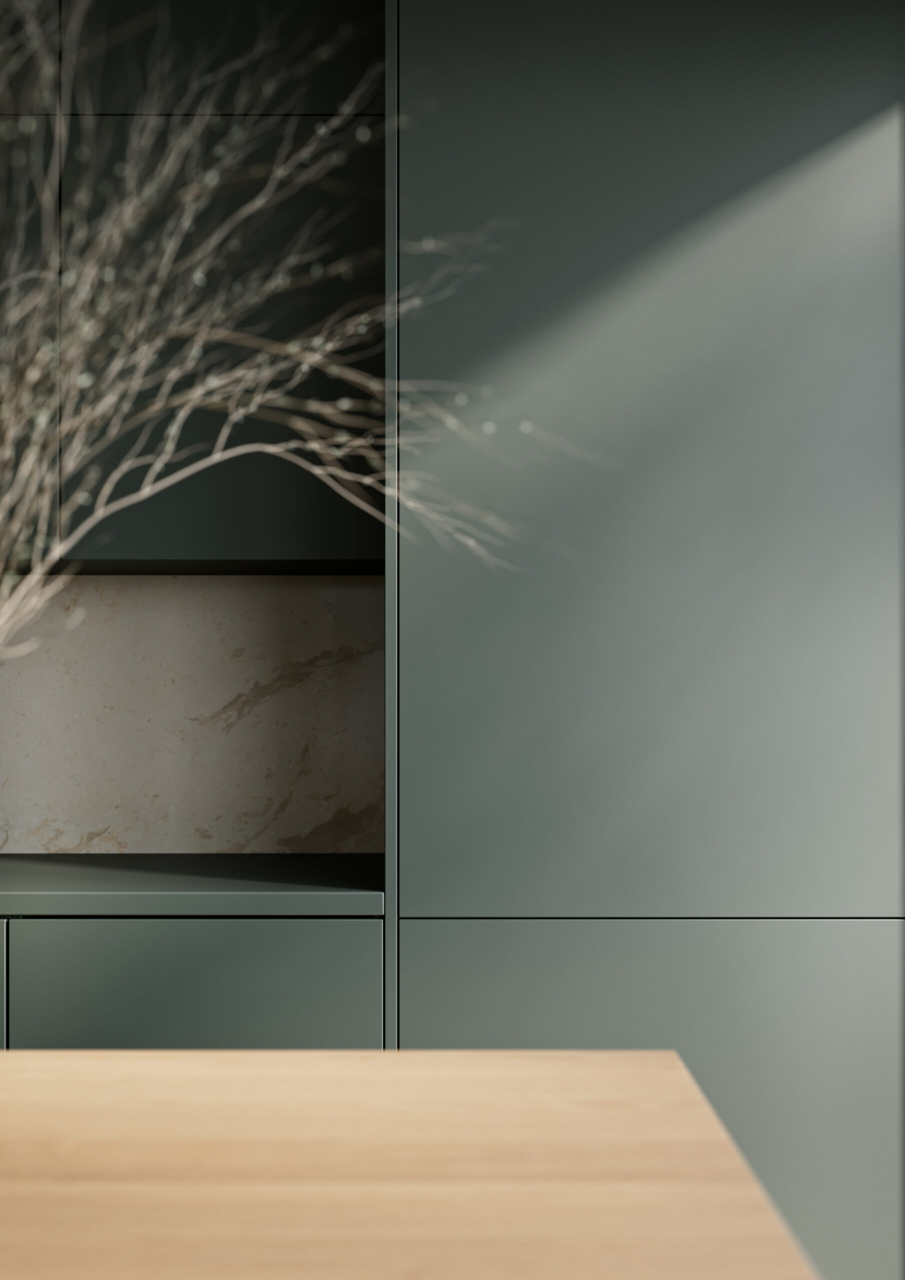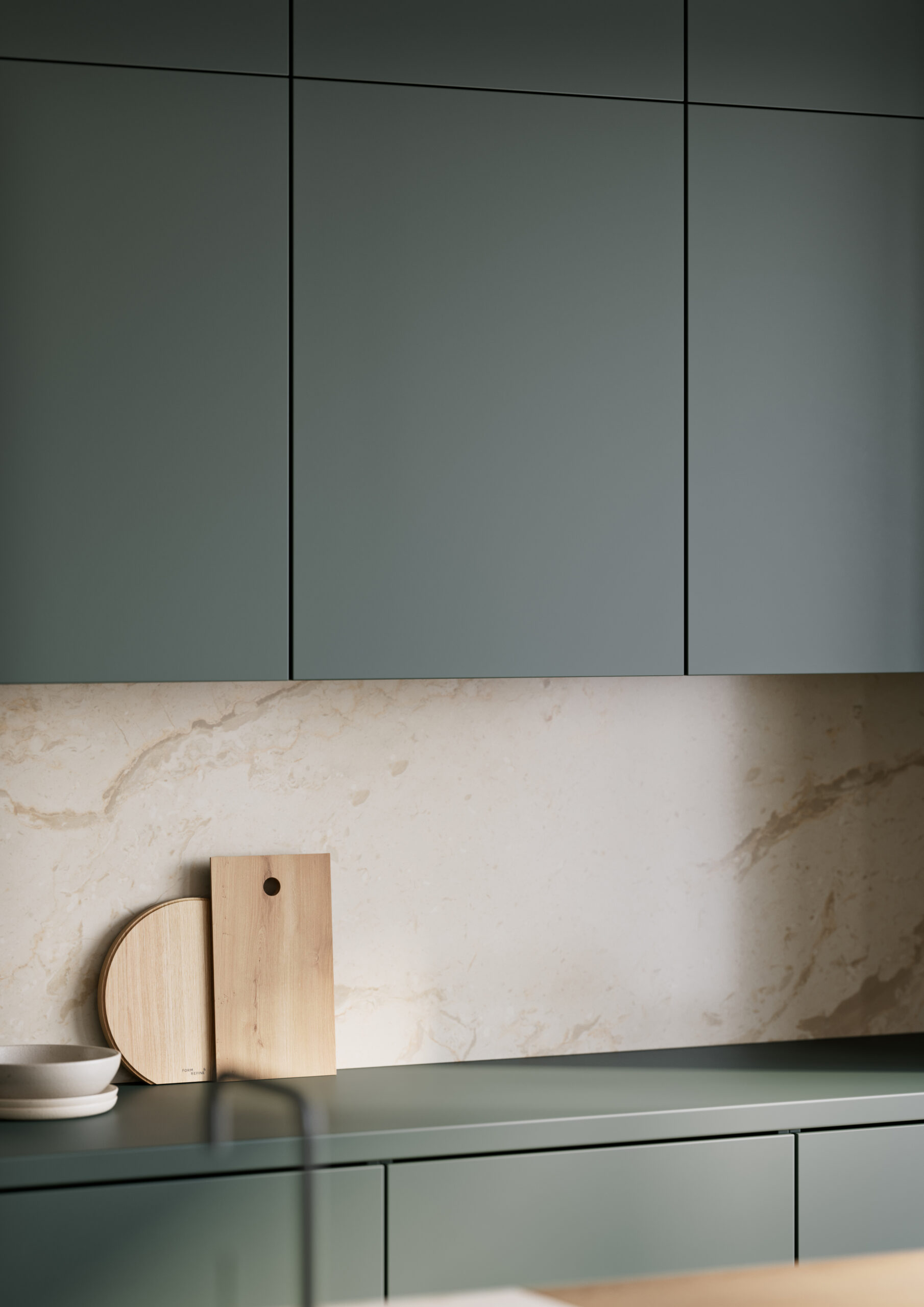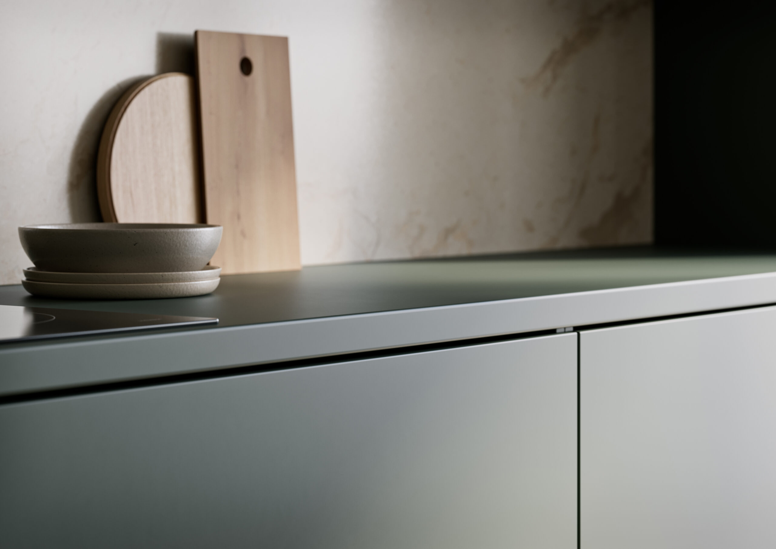 Sprytna alternatywa dla frontów lakierowanych: połączenie funkcjonalności z estetyką. Aksamitnie matowa i jednolita powirzchnia nadaje się różnych zastosowań – od kuchni po salon.